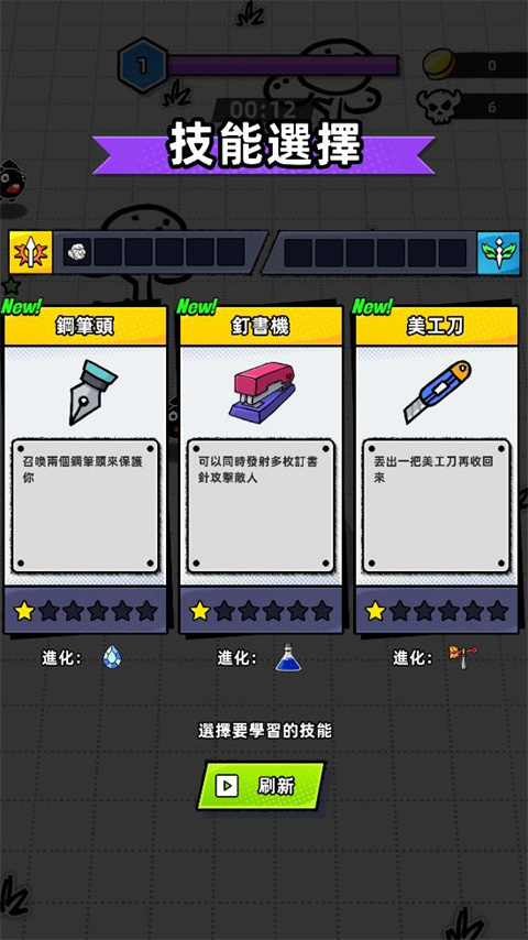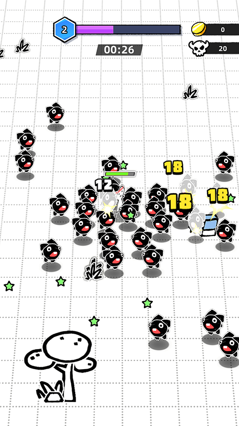 1. 割草式战斗与技能组合:玩家进入关卡后自动释放基础攻击,每击败一波敌人可三选一升级技能,例如“剪刀穿透”可直线贯穿多名敌人,“油纸燃烧弹”可制造持续伤害区域,技能组合可产生连锁反应。