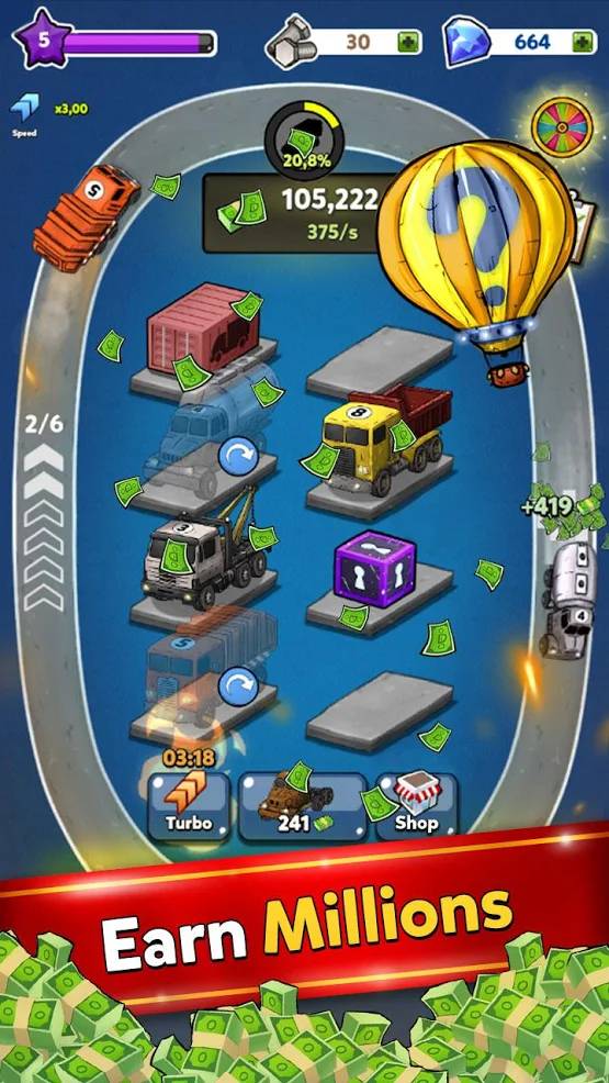 1. 独特的合并机制:玩家可以通过合并相同级别的卡车来获得更高级别的卡车,这种独特的合并机制让游戏充满了挑战性和趣味性。