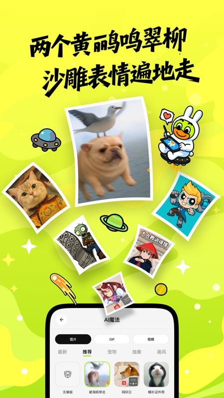 2. 强娱乐性社交设计:将“玩梗”“抽象创作”融入核心玩法,推出“表情包工厂”“整蛊神器”等模块。用户可将AI生成的图片直接转化为动态表情包,或通过“照片爆改”功能将好友照片变成“外星人”“僵尸”等搞笑形象,单日生成表情包超50万张。