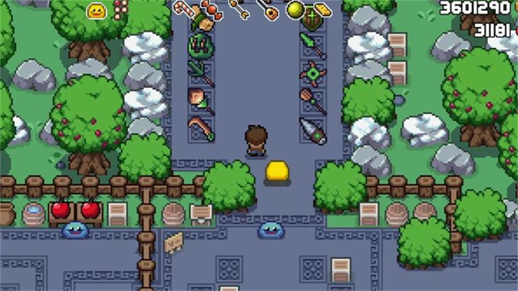3. 失败机制:角色血量为零时闯关失败,可返回村庄使用资源购买道具强化自身,逐步解锁更高级武器与史莱姆伙伴。