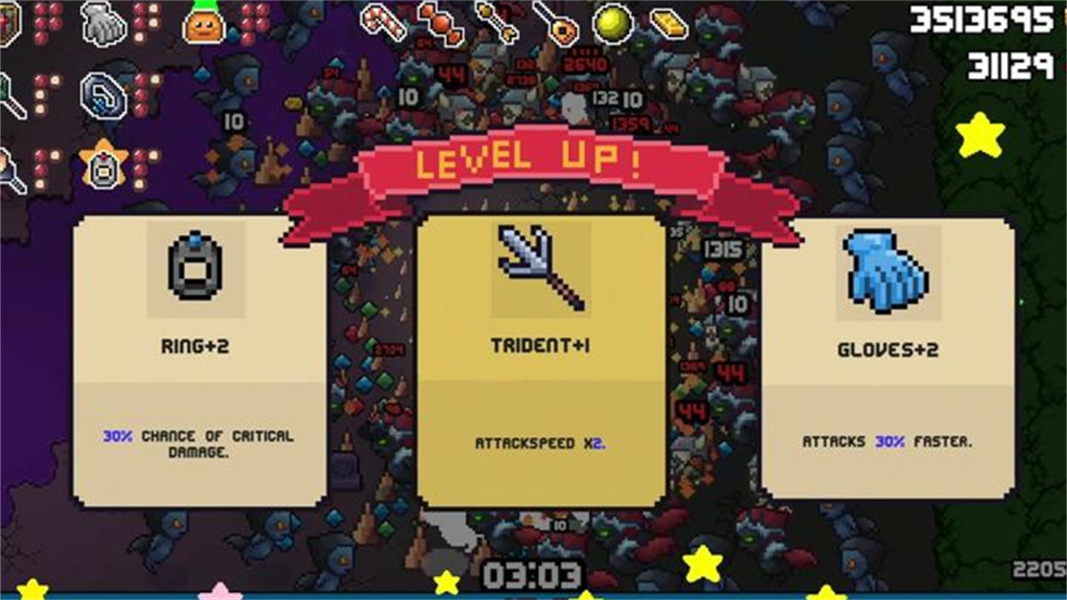 2. 资源获取:击败敌人掉落经验宝石提升等级,每次升级随机获得强化选项(如攻击力提升、生命值恢复);收集金币购买武器升级,水果解锁强力道具。