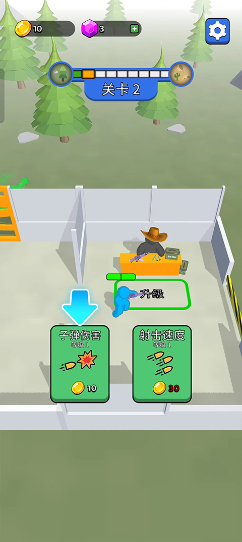 1. 基础操作指南:首次进入游戏后,拖动右下角摇杆控制角色移动,点击“迎战”按钮进入关卡。角色会自动攻击栅栏方向的僵尸,玩家需集中注意力躲避精英怪的特殊攻击(如巨型僵尸的冲锋)。通关后获得金币奖励,优先升级武器子弹伤害,以提升后续关卡效率。
