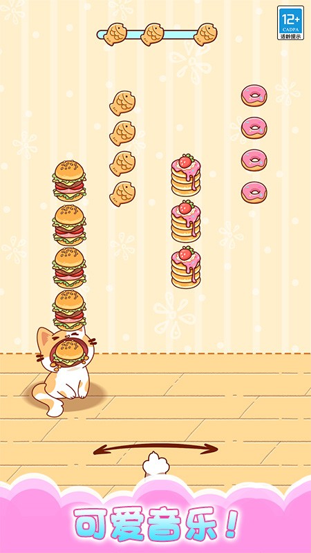 2. 萌系视觉与动态反馈:小猫角色拥有超过20种表情与动作动画,接住食物时会触发摇头晃尾、开心转圈等互动反馈,搭配食物碰撞的卡通音效,强化治愈感体验。