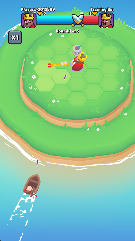 1. 核心玩法:玩家通过点击“battle”按钮开启关卡,初始选择一张卡牌放置在战场方块上,国王旋转时经过建筑会自动召唤小兵攻击敌人。消灭每波敌人后可获得新卡牌,相同卡牌可合并升级,提升小兵战斗力。