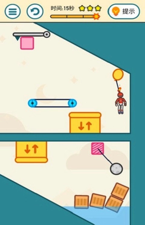 2. 关卡策略:初始关卡以教学为主,重点训练玩家对物理机制的利用(如杠杆原理、重力方向)。例如,在“森林吊桥”关卡中,需先切断左侧绳索使吊桥倾斜,再点击右侧喷泉推动火柴人坠入水中。