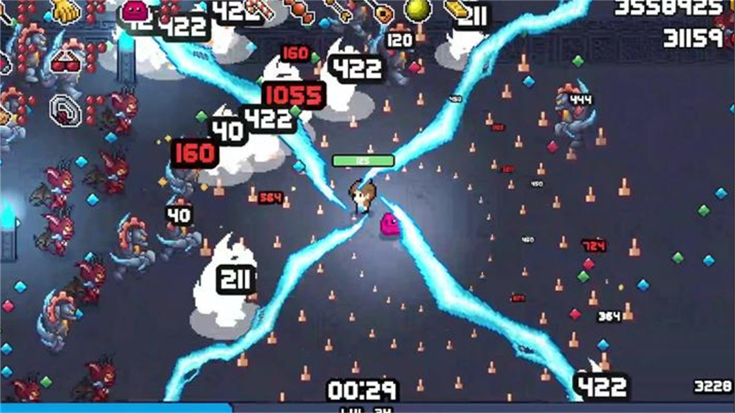 3. 40+道具与武器自由搭配:游戏提供超过40种功能各异的道具和武器,玩家可通过收集金币和水果解锁新装备,并通过自由组合打造强力Build。例如叠加攻击速度的“狂暴流”、依靠范围伤害的“清屏流”,或利用吸血鬼种族的生命偷取特性改变战场节奏。