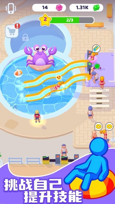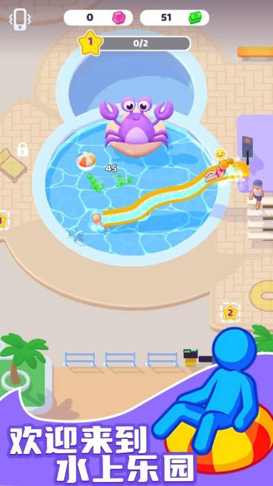 2. 深度设施定制系统:玩家可自由调整滑梯的弯曲角度、泳池形状、水温参数,甚至为桑拿房设计专属精油配方。例如,在“未来科技城市”场景中,可建造全息投影滑梯与磁悬浮冲浪池,打造科幻主题乐园。