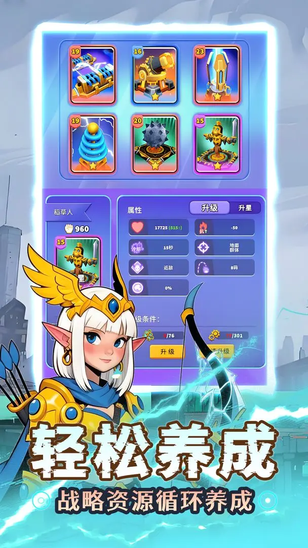 4. 丰富养成与离线收益:通过章节关卡、无尽模式与挑战试炼获取资源,可升级英雄等级、强化装备(武器、帽子、衣服等八槽位)、升星防御塔(解锁更强特效),家园系统提供离线资源生产,即使离线也能积累金币与材料,降低养成压力。