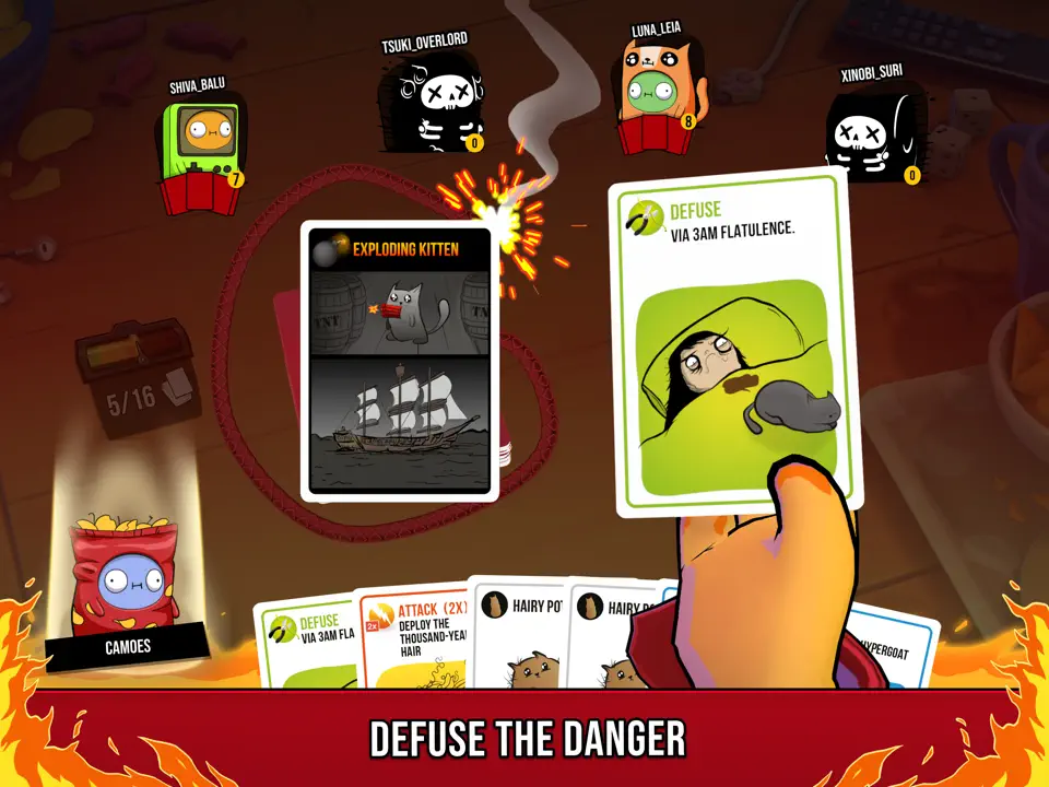 - 内爆猫:牌面向下时被抽中会秘密放回牌堆任意位置,牌面向上时抽中者直接出局且不可被"拆弹卡"解除