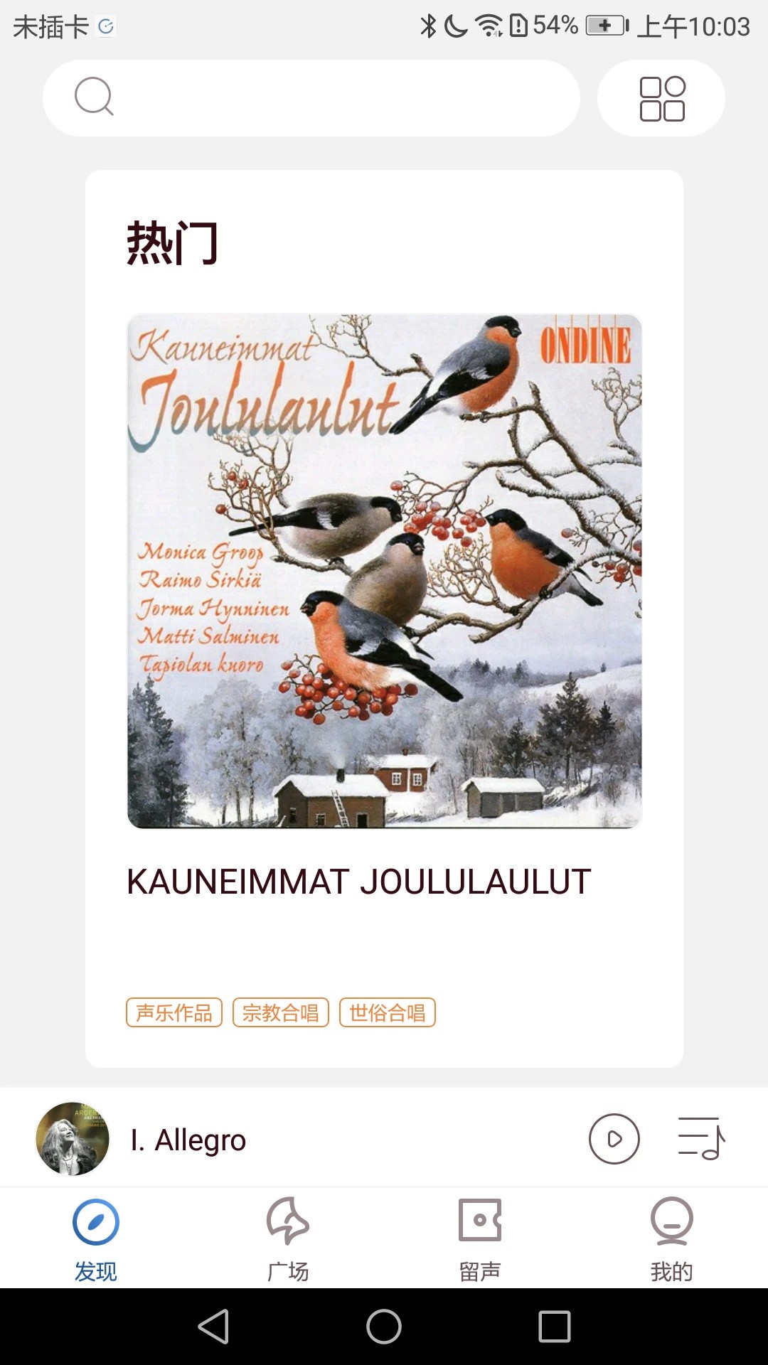 2. 资源浏览:登录后进入“发现”页面,点击右上角图标展开九大分类版块(经典分类、世界民族、音乐时期等),通过分类筛选或搜索框输入关键词快速定位目标曲目。
