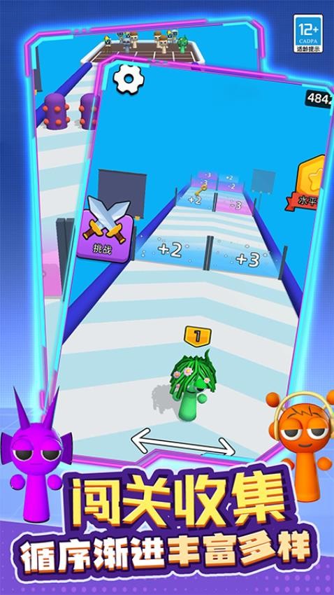 1. 角色合成进化:玩家需在赛道中操控角色左右移动收集同类,通过长按合并触发进化机制。例如,两个初级“火焰精灵”可合成为“烈焰战士”,攻击力提升300%,同时解锁范围灼烧技能。合成过程需观察角色位置与合并时机,实现高效进化。