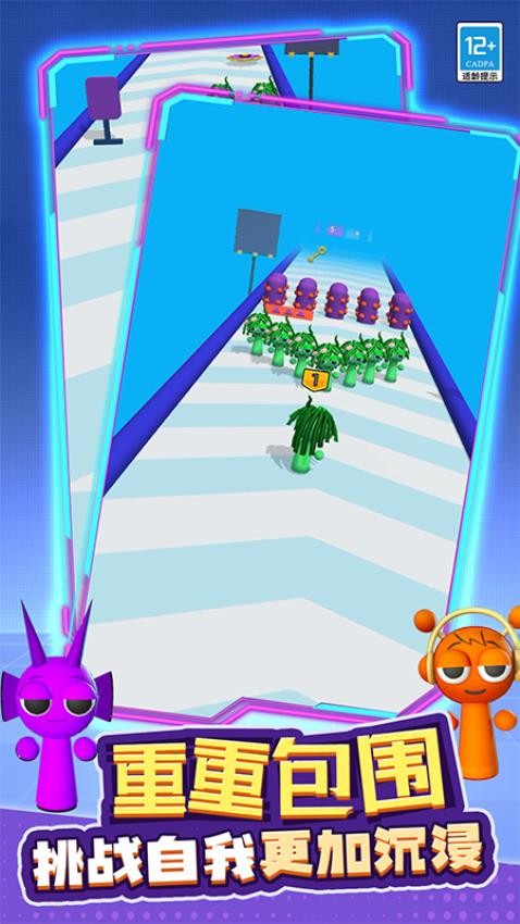 《融合战争精简版》是一款以策略合成与角色养成为核心玩法的安卓休闲手游,将休闲跑酷、策略布阵与角色进化深度融合。游戏以Q版卡通画风构建动态战场,玩家通过操控角色在动态赛道中左右移动收集同类角色,通过长按合并触发进化机制,将低级角色升级为拥有更强属性与技能的形态,同时需应对动态环境机关与实时策略对战,在烧脑策略与趣味融合中征服关卡,体验“以小博大”的逆袭快感。