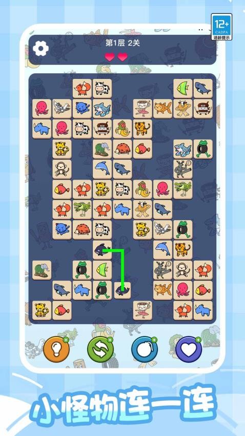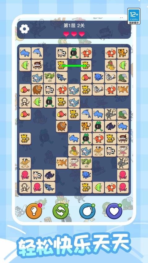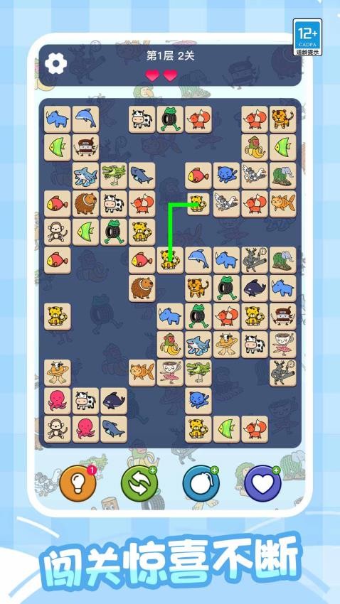 1. 基础消除规则:玩家需在网格界面中找出两个完全相同的动物图案,通过不超过两次转折的路径连接(即三根以内直线),连接成功后图案消除,清空棋盘即可通关。