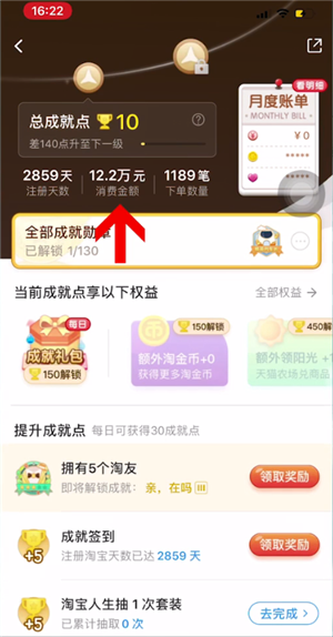3、这时即可在总成就点下看到总消费金额和注册天数了。
