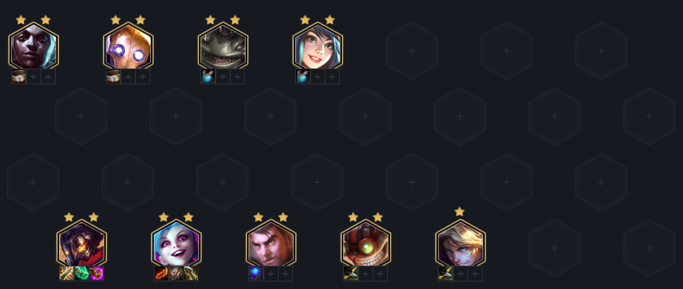 在五阶段前看情况上九,这时候千万不能贪,梭哈完当前所有经济直至阵容成型,把场上EZ卖了装备转给双C并挂上多留的那张多保持6极客。站位整体沉底,杰斯在中间给大家加攻速,有蓝buff可以更快启动,维克托的平A可以破甲,和金克丝站在一起帮助金克丝快速启动,注意对位婕拉和刺客时候要避开。有发明转可以开5发明,黑魔转开4黑魔,极客转则看情况下掉质量低的极客英雄。散件尽可能多给极客单位让极客盾更厚,C位容错更高。