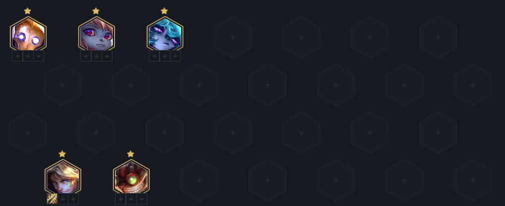 三阶段的3-2升六,有艾克则开4极客,尽量给满散件装备提升即时战力保证连胜,有卢锡安也可以开2枪手打工,场上的一切以战力为主,看情况4-1之前拉七,记住手上需要留一张EZ。