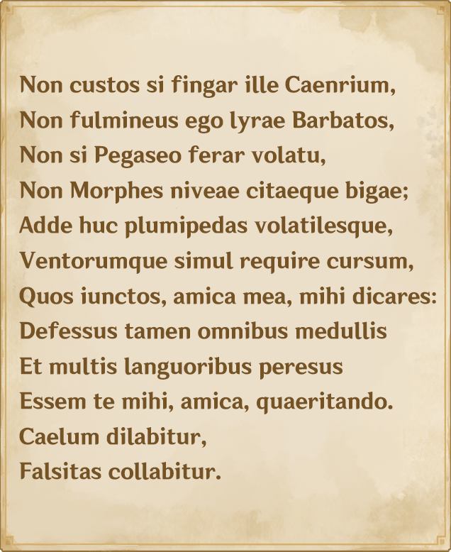 知道这个背景咱们再来看,58b的这前七句是不是都是在说一件事,那就是“急”,换句话说,就是在堆叠加速buff,看原神这一版也是这样,前两行虽然疑似说了遗迹守卫和巴巴托斯,但是这里很可能只是在比喻自己在找谁的迫切的心情。前面幻想自己是各种迅捷的事物,而第八句开始转折,说,即使我有前面这么多加速buff,我找你找得也很艰辛。原神里这首和原诗不一样的地方是,原诗找的卡梅里乌斯是一位男性(amicus),但是原神这里都改成了女性(amica),所有很可能作者是在寻找一位女性朋友。