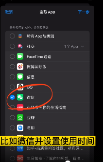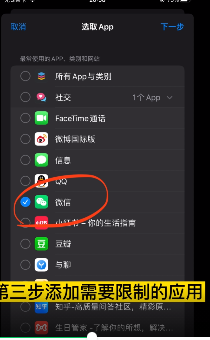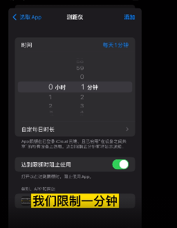 第三步:添加需要限制的应用比如微信并设置使用时间,我们限制一分钟。