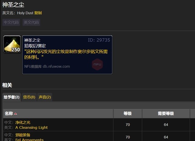 玩家们在外域击败外域的恶魔级别的怪物,从而获取掉落的邪能装备,返回沙塔斯的奥尔多高地,找到NPC伊沙娜,将邪能装备提交给她并完成重复任务,就可以获得一个神圣之尘和350点奥尔多声望了,一个邪能装备只能够获取一个神圣之尘。