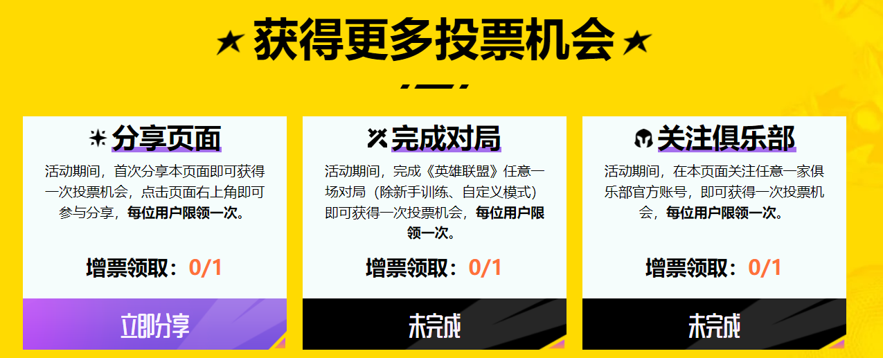 1.活动期间内,在活动页面绑定《英雄联盟》游戏大区角色信息且等级达到30级及以上的用户,每日可获得一次投票资格,每日0:00刷新,该资格不累加,仅当天有效。完成模块二任意一项任务即可额外获得一次投票资格,额外任务无角色等级限制;