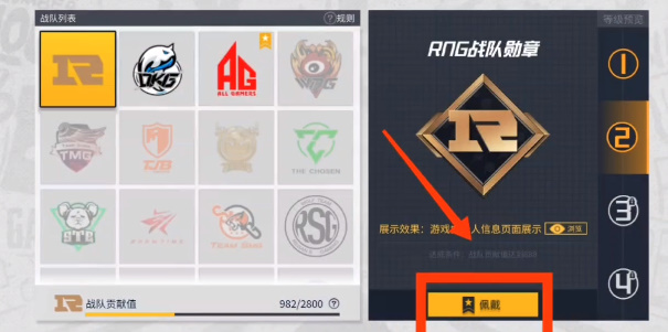 5、第五步:选择不懂等级’的战队勋章,然后点击佩戴,在游戏中昵称前面就会显示勋章图标。