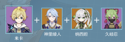 通过米卡的攻速提升提高神里绫人的普攻攻速,进而增加水元素伤害,增加水元素附着次数,且通过米卡的元素爆发增加队内的治疗效果,弥补因堆叠元素精通导致治疗量下降的久岐忍的不足。