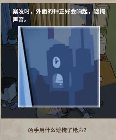 4、凶手是用什么掩盖了枪声,案发时,外面的钟正好响起掩盖住球枪响。