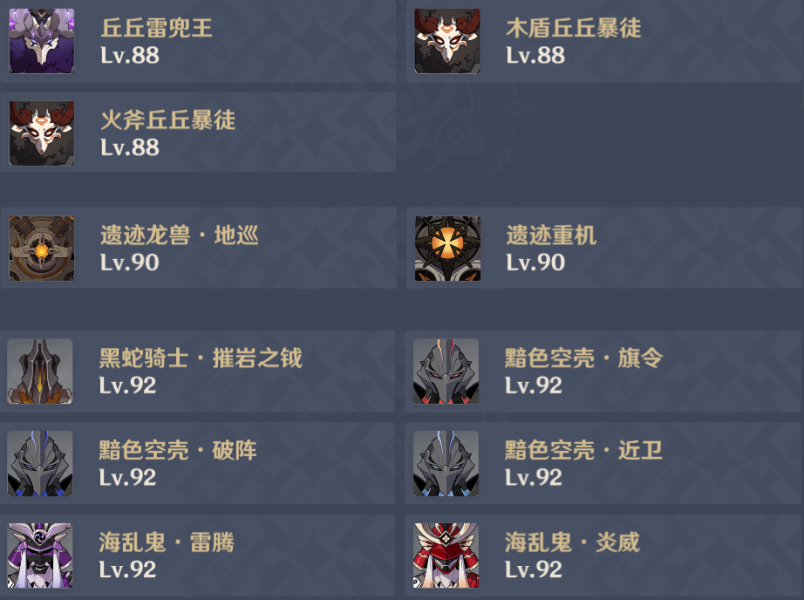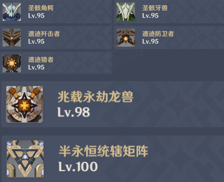第一间新版精英圣骸兽组合融合遗迹机关敌人看守一间,许久没有登场的遗迹猎手也复刻了。注意一下像万叶、魈这类有纵轴移动手段的角色,别一开局就勾引出来遗迹猎手的起飞状态。不然你又要准备弓箭等对空击坠方法的手段了,超长时间的滞空会让一些小伙伴崩溃的。圣骸兽的攻略方法,只能输出灌足快攻或者等它们吐出能量块后走机制打瘫痪。