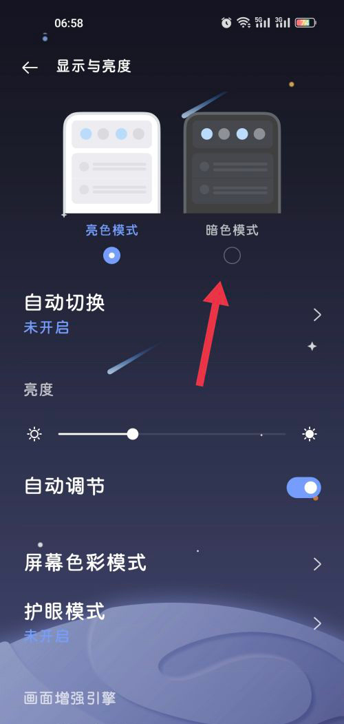 在控制中心进行调节方法:从手机屏幕左上角往下拉,点击【暗色模式】即可。