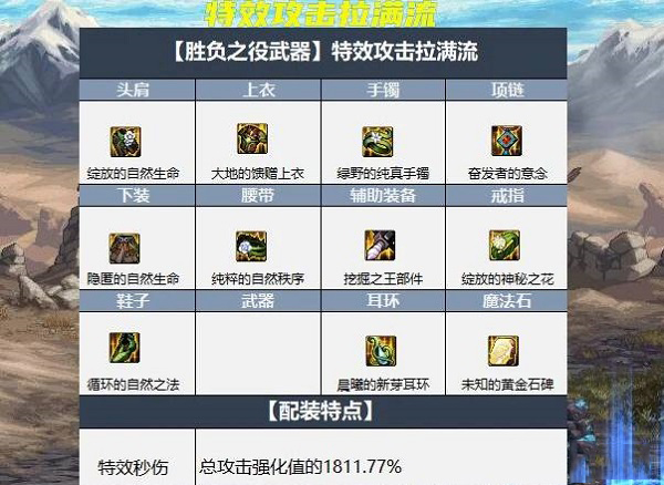 相比较特效属强流,这套“特效攻击拉满流”,总攻击强化数值1811.77%,属于特效伤害最高的搭配,没军团项链可替换无尽的愤怒连击;