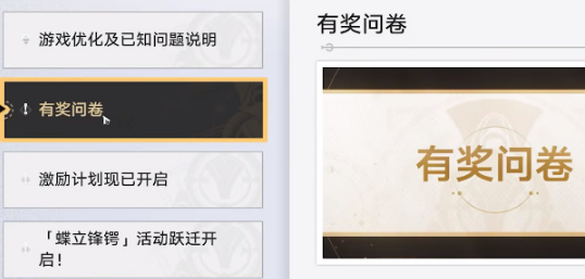 3、之后在公告栏的左侧菜单中,玩家可以在第二行找到【有奖问卷】,点击进入界面;