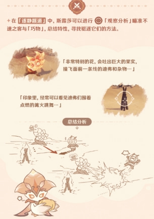 在游戏关卡内玩家需要操控斯露莎来进行观察地图分析,进行驱逐丘丘人,具体特征和总结分析如下图。