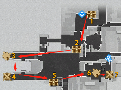 2、到达任务地点之后,我们按照标记好的路线寻找宝箱的位置,在这里我们一个可以收集到7个宝箱,第三个宝箱需要罗盘解谜才可以拿到,第四和第七个宝箱需要击败怪物才可以拿到,第六个宝箱需要魔方解谜才可以拿到。