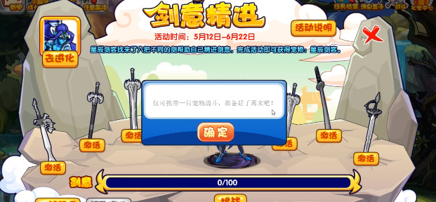 2、激活六把不同的剑时,仅可携带1只宠物进行挑战,挑战成功即可完成激活;