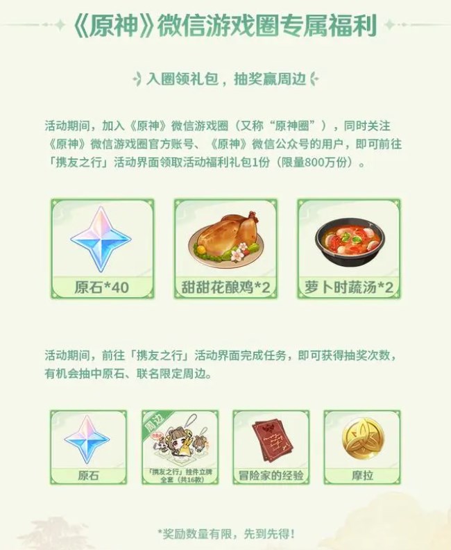 1、亲爱的旅行者,「携友之行」原神×微信游戏 联动现已开启。