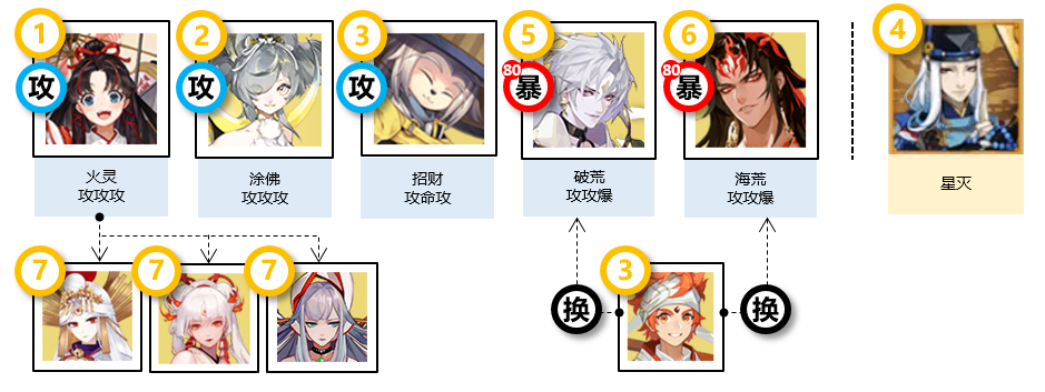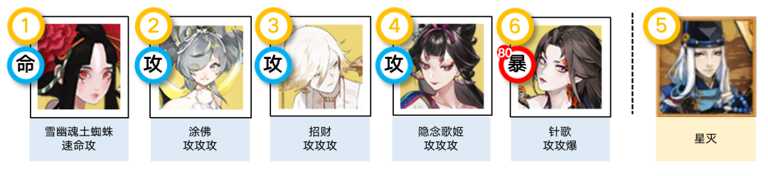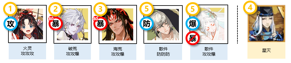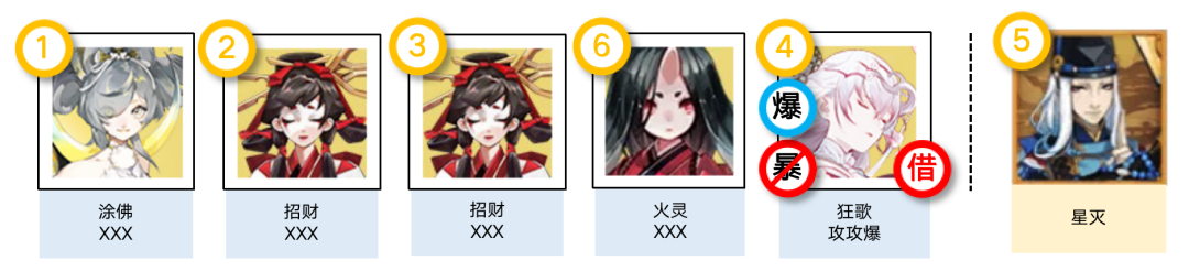 【替换】缘结神可换成稻荷神御馔津、浮世青行灯、不知火,御魂均攻击 2 件套沉底,但时间会慢 2-4s。神堕八岐大蛇和阿修罗可换成单个输出搭配食灵,但时间需要 24-25s
