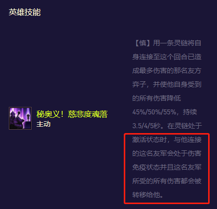 反常增幅:提供1个【慎】。他的技能会持续额外的5秒并且与他连接的那名友军在被保护时会造成20%额外伤害。