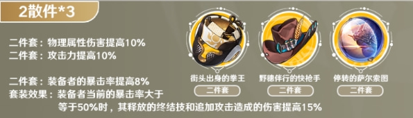 【停转的萨尔索图】两件套可以加强克拉拉的暴击率为12%,如果属性暴击值高于50%的情况,那么将会提高15%伤害为您的大招伤害和追加技能。