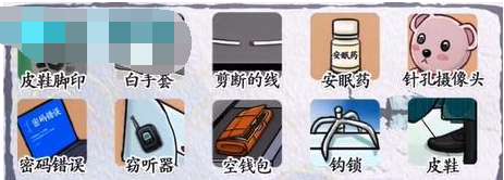 挑战巨人独居女孩答案:皮鞋脚印、安眠药、剪断的线、白手套、针孔摄像头、钩锁、密码错误、窃听器、空钱包、皮鞋