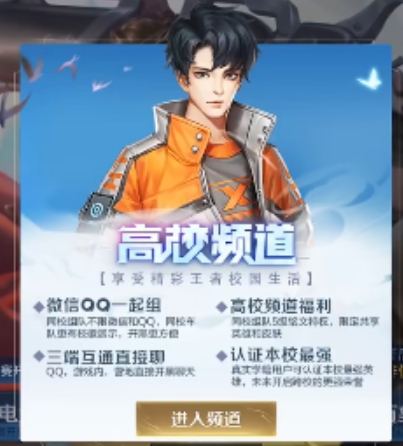1、首先通过上方点击进入高校的认证入口,然后来到王者荣耀校园频道,选择进入频道操作。