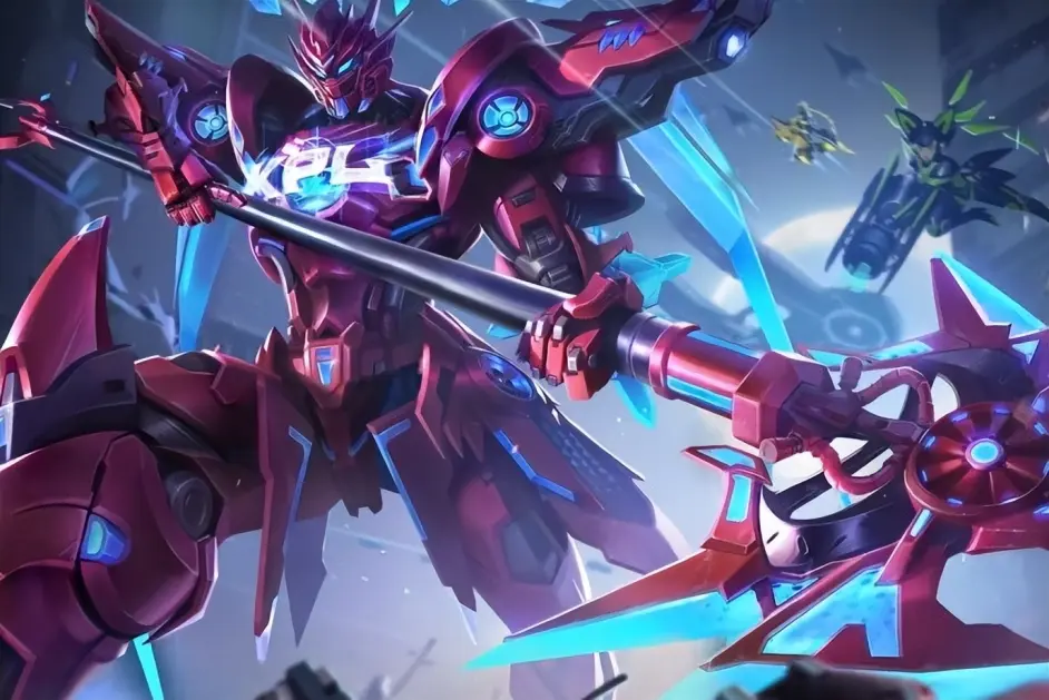 2、皮肤的建模效果如下图所示,色彩上参考了KPL赛事经典的红蓝配色,机甲细节十足并且融入了龙的一些特征化图形,机身侧翼印有KPL作为装饰,且局内的附魔的标记效果也会有对应的改变。
