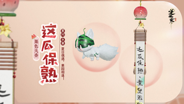 点明武器名称,以夏日西瓜主题来制作,就连素问身旁小灵狐都披上了伪装的西瓜头,漏出一只眼的缝隙偷偷围观;