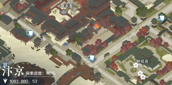 1、首先玩家是需要先进入到游戏中,在地图上是找到这个甜水巷,然后是到达汴京【1083,880】处。