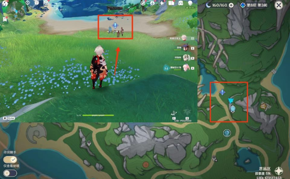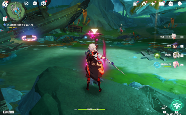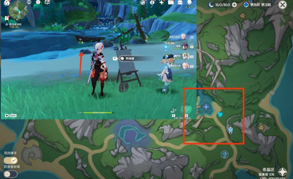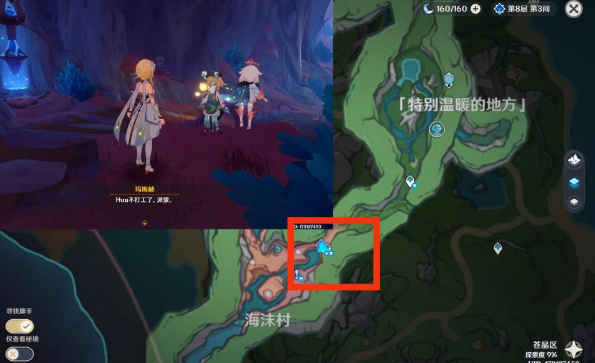 2、之后前往西北方向的海沫村,来到图示位置后,我们下潜进入水中,在这里我们需要持续下潜大概120m;