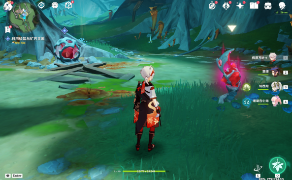 7、玩家要利用棱晶与矿石共鸣,前面的这个就是棱晶,攻击棱晶,会向前释放出一道黑色的能量,我们角色与矿石与棱晶三点一线,对准矿石后攻击棱晶即可使其共鸣;