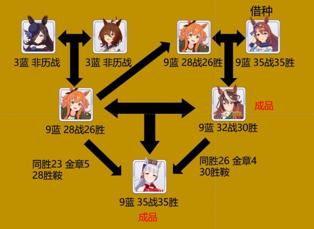 简单来说,历战马的父母和历战马要出场并赢下尽可能多的相同比赛,来获取更高的胜鞍。由于中长马能获得的比赛金章更多(共5种),比如赢下皋月,德比和菊花赏的经典三冠金章,因此练中长马是主流选择。
