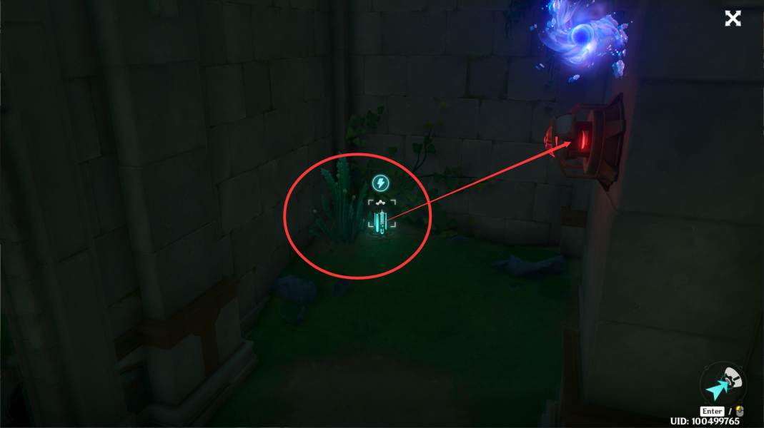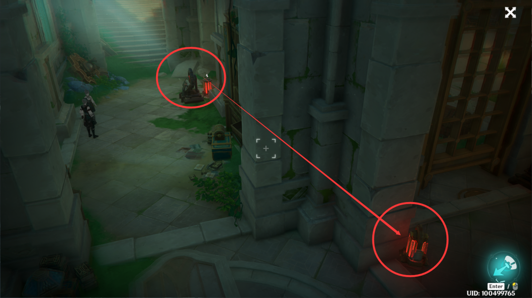 ⑤借由机关将门口的能量移动到这个解密道具上,随后拾取其放置到关着的门旁边。