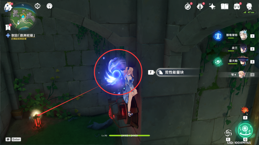 ①入口进来后过一小段剧情,往最里面走,拾取里面的荒性能量块。