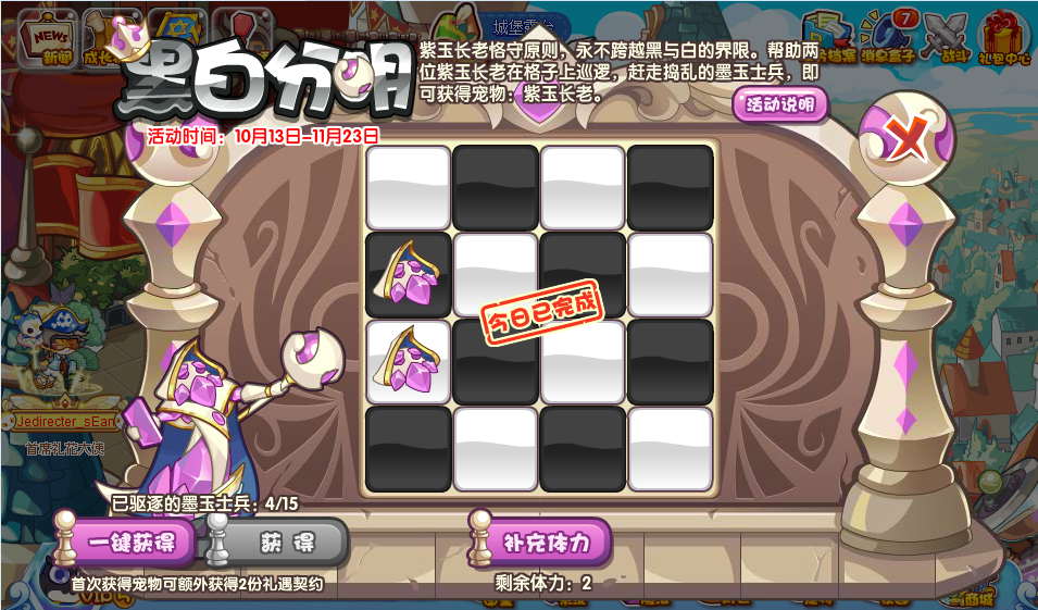 黑白棋盘有两个紫玉长老,他们恪尽职守,绝不跨界。小洛克们需要先“补充体力”与石之帕蔻发起挑战,战斗胜利可以获得5点体力。挑战次数不限制,逃跑/失败也不影响活动进度。