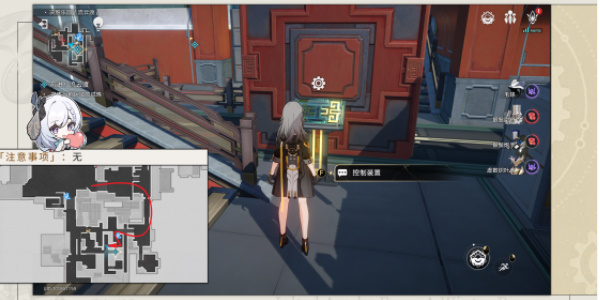 4、接着跟随指引来到控制装置前,选择左移;然后再来到南边高台的控制装置前,选择右移;最后来到下图显示所在的位置,对准纹样(发光说明对准),按R拍照即可。